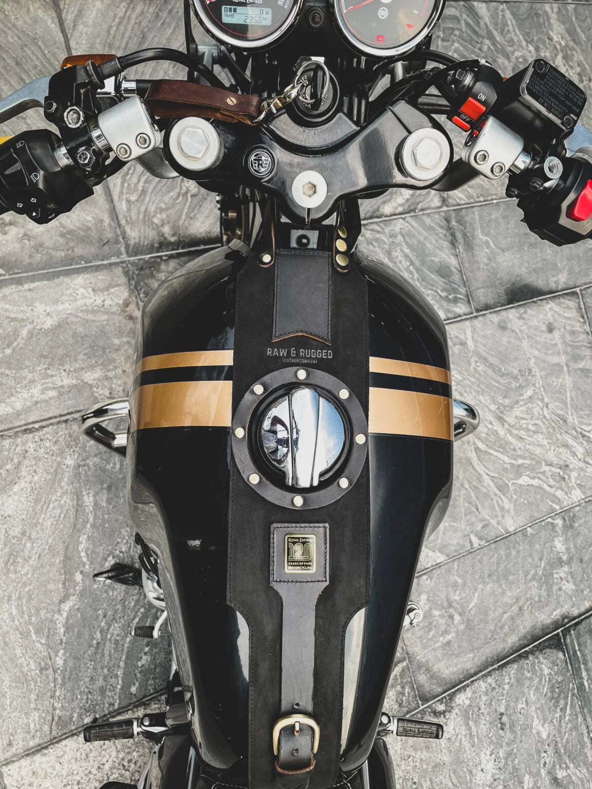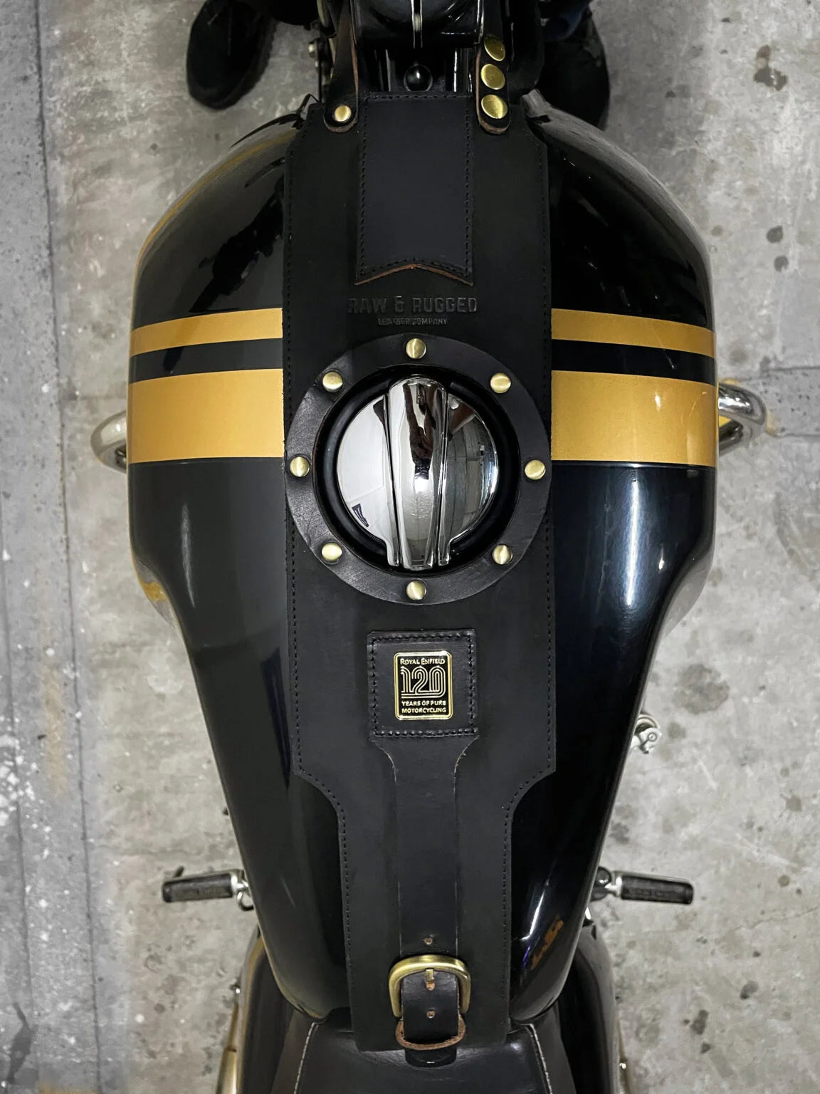 On this note, after many design iterations, sifting and refining, we humbly present to you our special edition ‘120 Edition’ tank straps for the interceptor and GT. Each strap is made from oiled nubuck and full grain leather of the highest quality, designed to be modularized and packed with oodles of detail. They come in two different colors that work with every shade of twins from Royal Enfield. And the icing on the top is that each strap comes with 120th edition RE badge along with a custom engraved brass plate with your name.