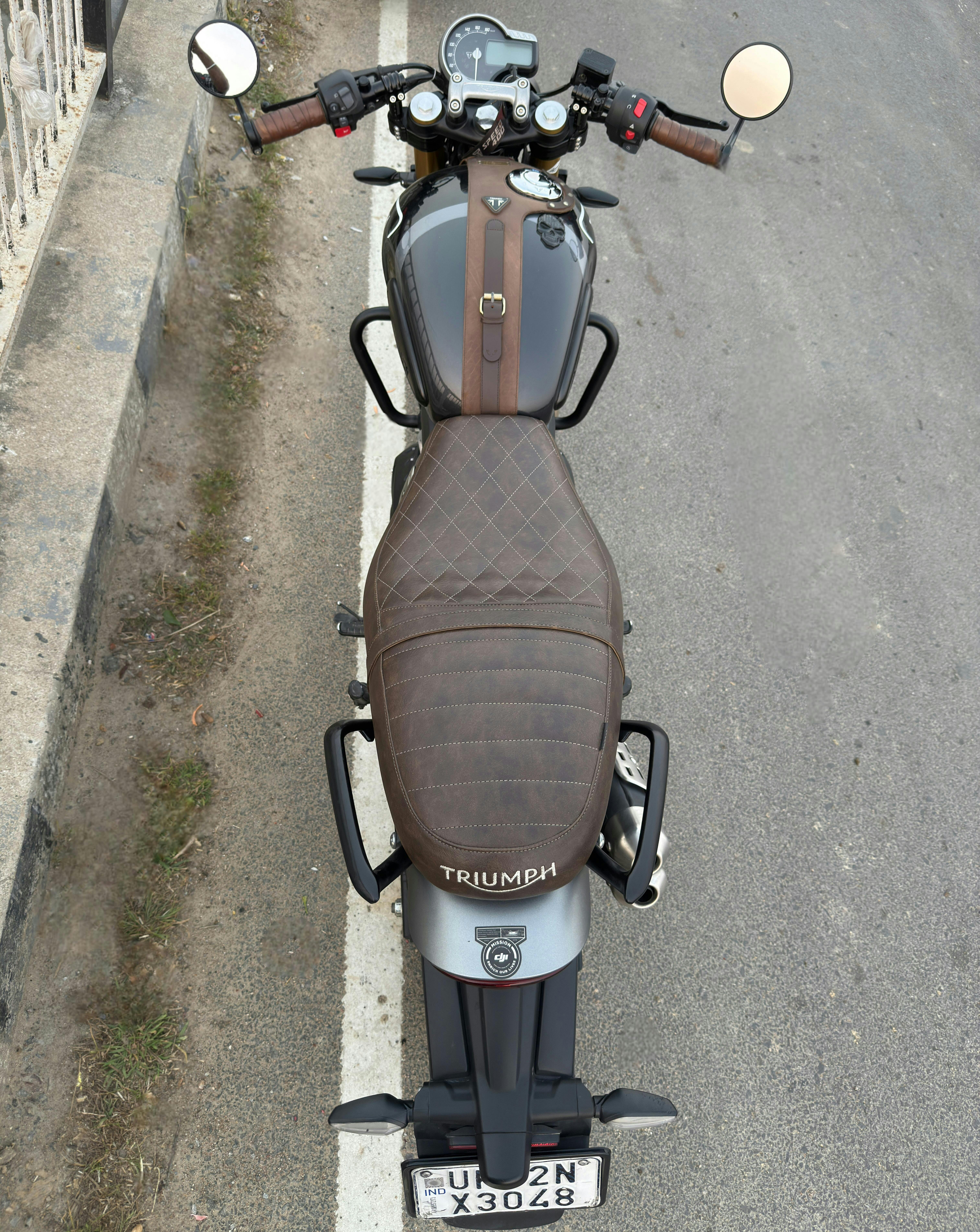 Add a bold, functional touch to your Triumph SCRAMBLER 400 with our rugged, thick oiled leather tank strap. Featuring a detachable mini pouch, this versatile piece can be strapped securely to your bike, clipped to your waist belt, or mounted creatively elsewhere. A classic Triumph logo, firmly riveted, adds a timeless appeal.